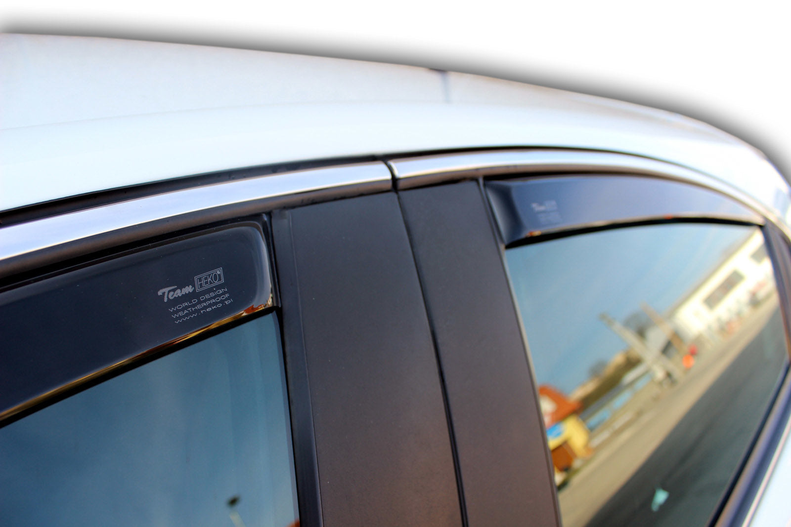 Deflectoarele de aer pentru geamuri sunt un accesoriu ce ofera un plus de utilitate masinii dumneavoastra dar in acelasi timp imbunatatesc design-ul acesteia, oferindu-i un aspect mult mai placut. Acestea asigura circulatia naturala a aerului in interiorul vehiculului, astfel incat geamurile pot fi intredeschise pe timp de ploaie, ninsoare sau ceata. Acestea protejeaza soferul de efectele neplacute ale fluxului de aer in autovehicul atunci cand geamul este deschis. Deflectoarele sunt fabricate din plastic de culoare fumurie cu o transmisie redusa a radiatiei UV. Heko Team este proncipalul producator de deflectoare de aer din Polonia pentru autoturisme, ce are clienti in intreaga lume. Caracteristici: